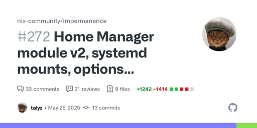 arrow-up19arrow-down1external-linkThe impermanence module just merged a home manager module refactorplus-squaregithub.comPaulemeister@feddit.orgEnglish · 16 days agomessage-square1linkfedilink