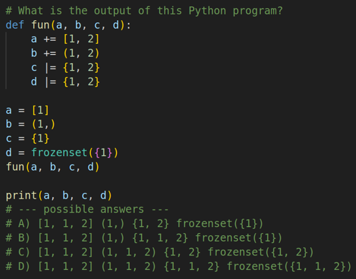 def fun(a = []): a += [1] return a fun() print(fun()) # [1, 1]issues I had with the tool you linked
