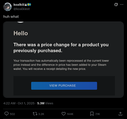mr_MADAFAKA@lemmy.ml to Steam@lemmy.ml · 6 months agoOther game companies could learn a thing or two from Valve/Steam.lemmy.mlimagemessage-square15linkfedilinkarrow-up1259arrow-down18