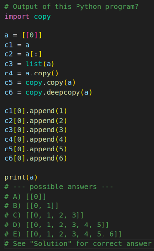 >>> import copy >>> >>> a = [[0]] >>> c1 = a >>> c2 = a[:] >>> c3 = list(a) >>> c4 = a.copy() >>> c5 = copy.copy(a) >>> c6 = copy.deepcopy(a) >>> >>> c1[0].append(1) >>> c2[0].append(2) >>> c3[0].append(3) >>> c4[0].append(4) >>> c5[0].append(5) >>> c6[0].append(6) >>> >>> print(a) [[0, 1, 2, 3, 4, 5]]copy.deepcopymakes a separate memory copy intoc6. So appending toc6affectsc6, but notaThis is what i get when click Play button