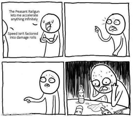 Fun fact about this in real life: A problem that gunmakers have had to deal with is that, although a faster-moving bullet fires straighter and penetrates better into its target, if the bullet moves too fast it will just poke a hole straight through a person without imparting enough of its kinetic energy onto them to be able to do real damage. So, i doubt the peasant railgun would be effective in real life.