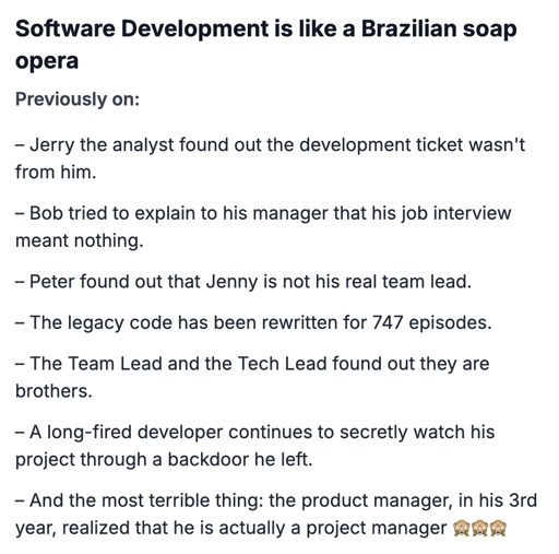 arrow-up175arrow-down1imageSoftware Development is like a Brazilian soap operalemmy.ml☆ Yσɠƚԋσʂ ☆@lemmy.ml to Programmer Humor@lemmy.mlEnglish · 4 months agomessage-square4linkfedilink