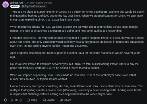 What I do seriously doubt is his claim of Linux users making up “less than .01% of the total player base”. It just seems incongruent with the total Linux user market share on Steam. Though he does qualify it by saying this stat is from when they stopped supporting Linux, i.e. 2019. The situation is obviously quite different now with Linux being at 3% total and ~6% of English-language users on Steam, so if it’s not an outright lie it’s at least very disingenuous.