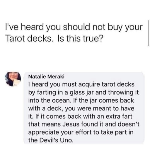 Text: “I’ve heard you should not buy your Tarot decks. Is this true?” Natalie Meraki responds: “I heard you must acquire tarot decks by farting in a glass jar and throwing it into the ocean. If the jar comes back with a deck, you were meant to have it. If it comes back with an extra fart that means Jesus found it and doesn’t appreciate your effort to take part in the Devil’s Uno.”