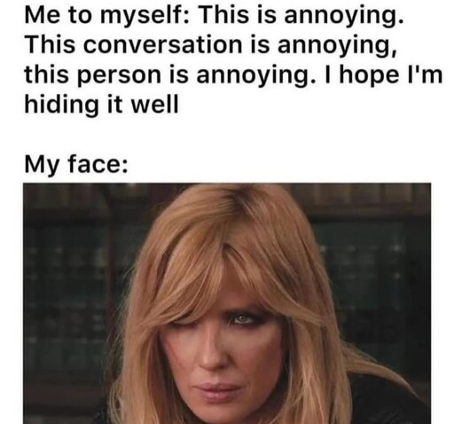 LadyButterfly she/her@piefed.blahaj.zone to Memes@sopuli.xyzEnglish · 1 month agoDo you have resting bitch face?piefed.cdn.blahaj.zoneimagemessage-square11linkfedilinkarrow-up1276arrow-down12