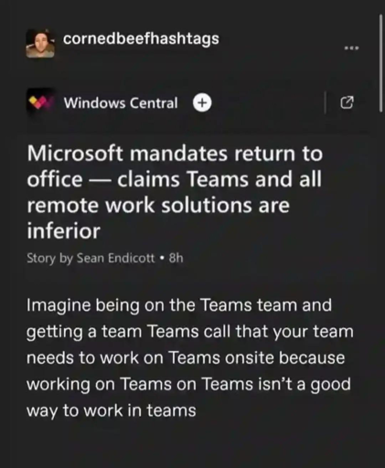 In office work is now spent walking from meeting to meeting, and you gotta leave 15 minutes before and it takes 15 minutes to get back and settled and you did not work on anything during. And they ask “so, how is project XYZ going?” “Good, good. Should be done in a few more weeks.” And you maybe work on XYZ for 30 minutes uninterrupted that entire day, decide to skip any testing or QC, skip those extra features, skip checking with other teams if it will impact them, you have to skip all that to get it done on time. And it takes 3 weeks to do a 5 minute task. And it’s inferior. And you talk about XYZ every meeting of every day, time after time, updates and statuses and comments on the ticket. And you finally announce you got XYZ completed and it’s “yay good job” and management asks how the RTO is going and everyone is terrified to say “this is stupid and a gigantic waste of everyone’s time and your money to put us in a giant expensive building just to not work on work, but to talk about working on work and we are getting only 10% done vs remote work”. So we say “oh, fine” and management puts a little golden star on their report they made for themselves and they feel all warm and fuzzy that work is going great.