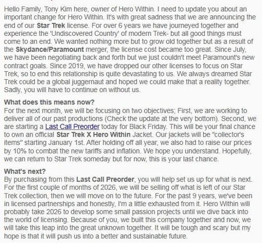 hopesdead@startrek.website to Star Trek Social Club@startrek.websiteEnglish · 19 days agoHero Within Announce End of Licensingstartrek.websiteimagemessage-square1linkfedilinkarrow-up115arrow-down10file-text