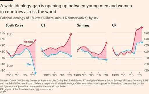 This essentially reflects the rise in incel school shooters except these young men just grow up to become bitter right wing misogynistic bigots instead. They have nowhere to go but right