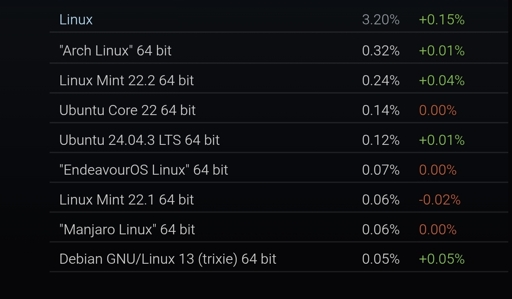 This site won’t update till tomorrow, but Steam’s English Linux numbers are >2x the overall numbers (China apparently hates Linux). Going to be something like 7% for English-speaking Linux use. :)