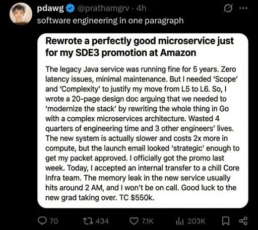 They built something worse and we’re still promoted for it despite it being demonstrably worse. Where’s the lie? They described something complex and techy sounding, did it, and got the promotion anyway regardless of the actual results, proving the results didn’t matter.