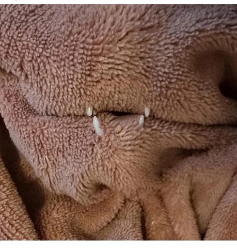 Cat is play fighting through the blanket and bit through it?