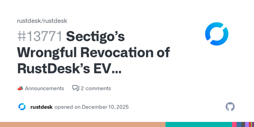 On December 8th 2025, Sectigo abruptly revoked RustDesk’s Extended Validation (EV) Code Signing Certificate without presenting any evidence of malicious behavior or security compromise. This unilateral action immediately disrupted RustDesk users worldwide, triggering false SmartScreen warnings, breaking enterprise deployments, and damaging trust in the software supply chain.