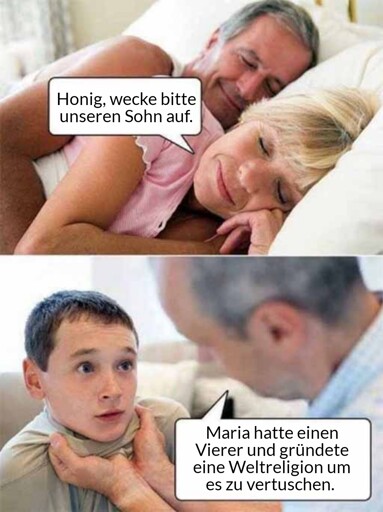 Funfact: das ‘unbefleckt’ hat nix mit Gottes Sperma zu tun, sondern, dass Maria frei von der Ursünde war. Weil…irgendein Pabst o.ä. sich das irgendwann so ausgedacht hat.