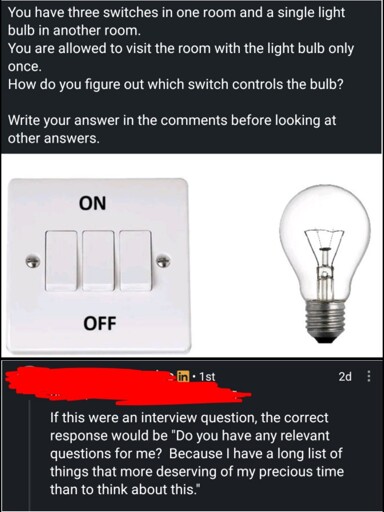 Even knowing the “correct answer” to this riddle for as along as I remember, I don’t think it is right. For someone looking for how to handle this in an interview, I’d go with this: