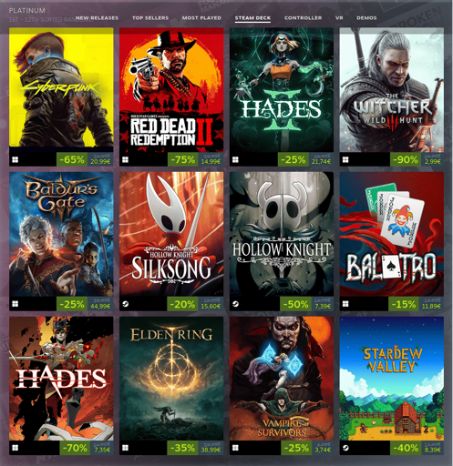 mr_MADAFAKA@lemmy.ml to Steam Hardware@sopuli.xyz · 22 days agoMost Played Games on Steam Deck for 2025lemmy.mlimagemessage-square76linkfedilinkarrow-up1348arrow-down12file-text