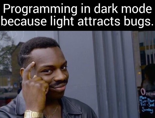 Programming in dark mode, because the lower brightness hides the fact, that I am actually crying 90% of my time.