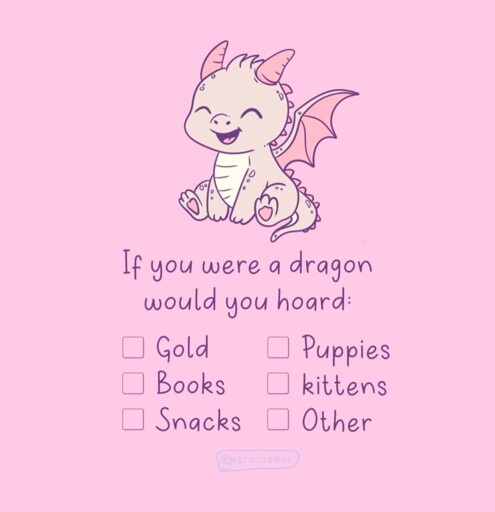 Realistically? I’m a dragon who hoards old cables (I’ve become my dad 😭), pieces of art from my friends, animal bones and teeth, and cassette tapes. A very eclectic hoard if I do say so myself