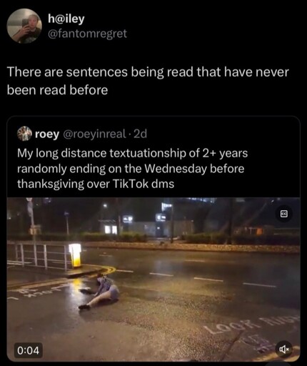 - [X] Image in context to Text explainedthanks @JankatarchThe long-distance relationship mostly conducted via text was going smooth but then it suddenly ended in a rough way as if wind from the video blew it over due to some TikTok direct messages.