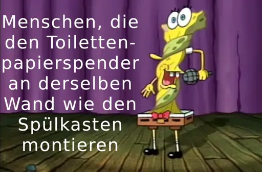 Ich auch, weil alles andere wahnsinnig wäre. So wie der Toilettenpapierhalter des Vormieters, DER BEIM KACKEN HINTER MIR IST.