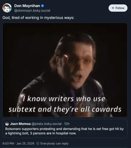 tangent asside, fuck using too much subtext, say what you mean. reading authors who intentionally don’t use subtext is such a breath of fresh air.