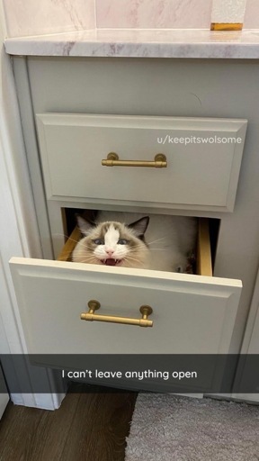 I have a cat who loves to shove herself into the drawer whenever I leave it just slightly creased - the wardrobe is behind me to the right so I don’t notice it and then 10 minutes later mom is frantically searching for her ass cause she likes to run away from the apartment, and it always turns out that little shit is in the drawer.