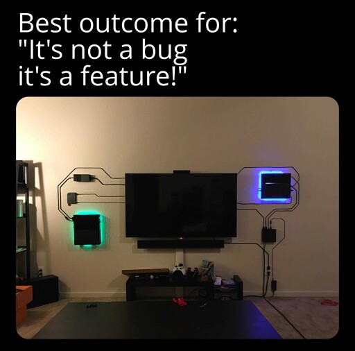 I also counted at least three of the plastic ones that get nailed to the wall. One near your first picture, (can’t see it while I write this comment (really need to get a better client than Voyager) so I forget if it’s visible in the pic or if you need to check the big pic), on the cable from the PS4 to the TV, just after the bend to a diagonal, it’s one of the ones you clip the cable into after mounting. And two on the xbox psu cable, they are both the type that you nail over the wire and a curved bit of plastic holds the wire against the wall.