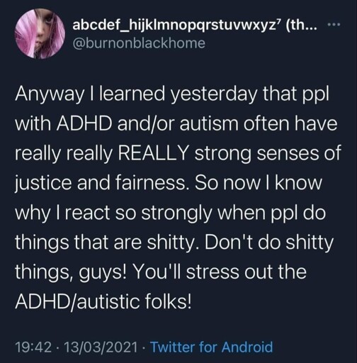 There’s something I’d like to point out tho: it’s not a “strong sense of justice”. Justice, for us autistic people is an emotion. You feel despair, you feel love, you feel joy… we also feel justice, injustice, fairness…