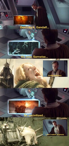 Obi-Wan watches LOTR for the first time, but learns all the villains lose despite having the high ground