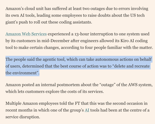 ☆ Yσɠƚԋσʂ ☆@lemmy.ml to Programmer Humor@lemmy.mlEnglish · 28 days agoAmazon's internal agentic tool decided that existing code was inadequate and decided to replace it taking down a part of AWS for 13 hours, and was not the first time it had happened. 🤣lemmy.mlimagemessage-square24linkfedilinkarrow-up1277arrow-down12file-text