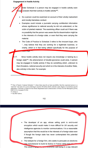 6.18. In each of these cases the motive of the app developer/ lobbyist/ journalist may be more sinister than first appears, so permitting an officer to examine whether the individual is a witting or unwitting agent of a foreign state might be described as necessary in the right circumstances. Serious responsibility is placed on police to use the power wisely.