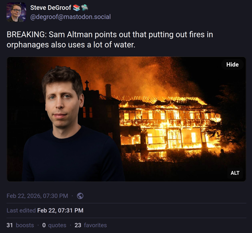 arrow-up11.19Karrow-down1imageBREAKING: Sam Altman points out that putting out fires in orphanages also uses a lot of water.media.piefed.socialSTHayden@piefed.social to Memes@sopuli.xyzEnglish · 16 days agomessage-square74linkfedilink