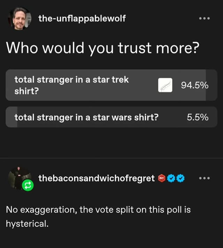arrow-up1559arrow-down1imageThe wildest part about this poll is that it was only shared to Star Wars sitesi.imgur.comUSSBurritoTruck@startrek.websiteM to Risa@startrek.websiteEnglish · 17 days agomessage-square74linkfedilinkfile-text