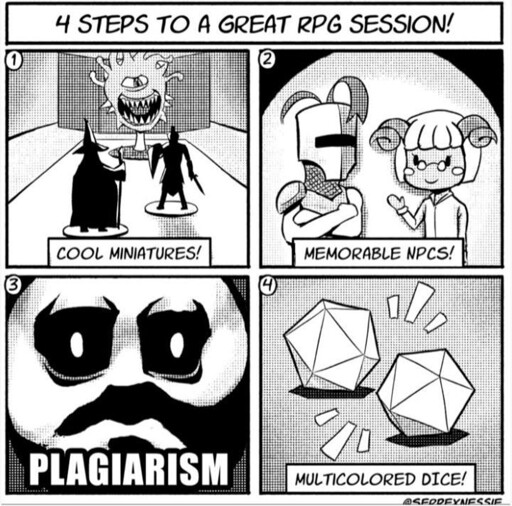 minus-squareruuster13@lemmy.ziplinkfedilinkarrow-up25·29 days agoIt’s not plagiarism if you’re not publishing. And I bet the DM knows exactly what their references are if players ask.