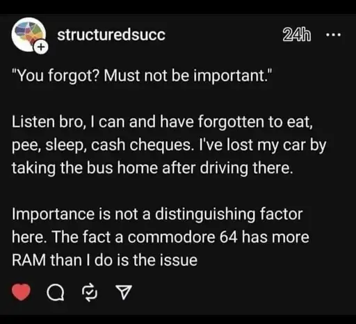 Dazharion@lemmy.dbzer0.com to ADHD memes@lemmy.dbzer0.comEnglish · 1 month ago"Important"lemmy.dbzer0.comimagemessage-square14linkfedilinkarrow-up1587arrow-down14