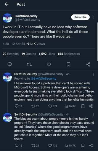 Because software devs have the weeks/months to learn vulkan every time they want to use a GUI for their job, or to learn compiler design whenever they wanna use java for their job