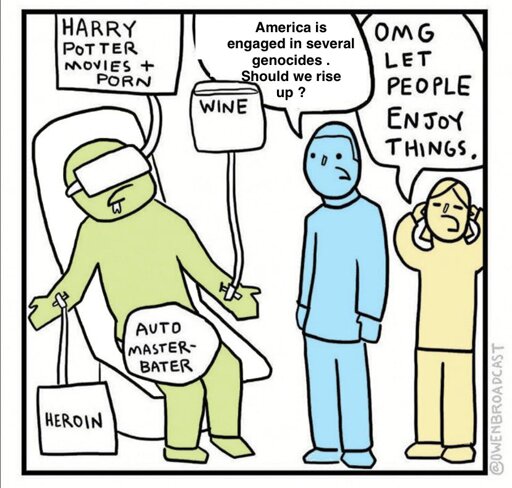 A fuck ton of us are paycheck to paycheck looking for any outlet to soothe our broken minds and bodies. I really hate this generalist talk about the us right now when so many of us are prisoners, glorified indentured servants. I literally don’t know how I’m going to feed myself for a couple of weeks right now. I fear ice just because I’m brown, especially here in the south.