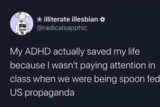 arrow-up1937arrow-down1imageBetween church, school, & targeted advertising my inability to focus has probably helped me subvert more brain washing than I'll ever really know. Maybe it's not so maladaptive in this dystopia?sh.itjust.worksBasic Glitch@sh.itjust.works to ADHD memes@lemmy.dbzer0.comEnglish · 22 days agomessage-square89linkfedilink