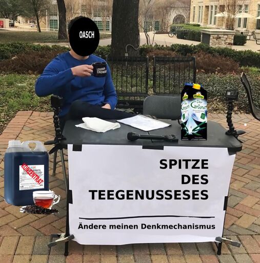 memevorlage kirk “change my mind” mit einem kanister teekonzentrat und einem tetrapack eistee. banner ließt: “spitze des teegenusseses. ändere meinen denkmechanismus”
