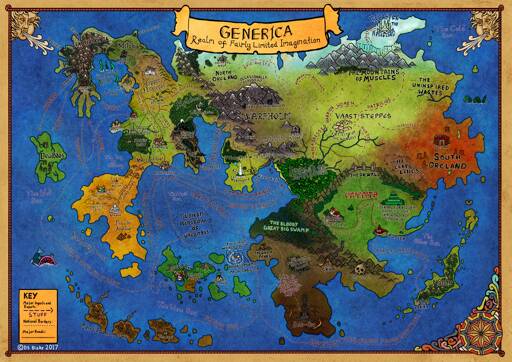 I know the joke is that it’s just a bunch of tropes, but if you just change the names to be less lampshady, this looks like it could be a good campaign map.