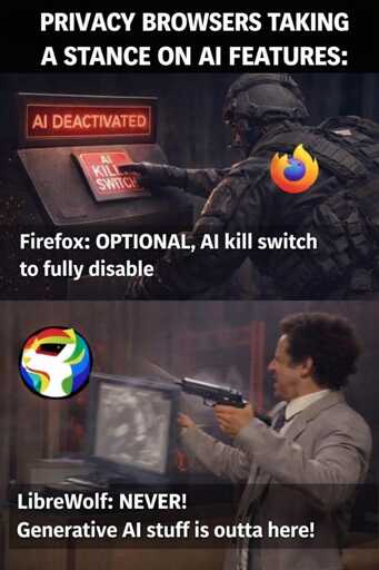 arrow-up185arrow-down1imageTwo Privacy Philosophies: Firefox vs LibreWolf on AIlemy.lolcm0002@lemy.lol to Memes@sopuli.xyz · 7 days agomessage-square8linkfedilink